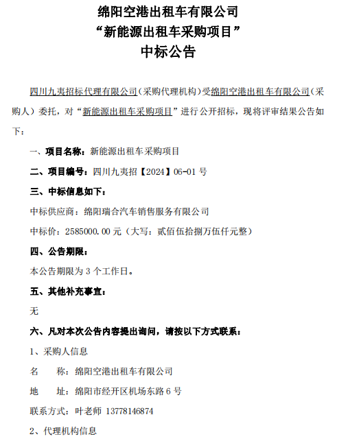 綿陽空港出租車有限公司 “新能源出租車采購項目” 中標(biāo)公告