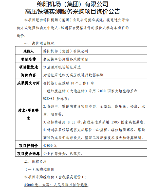 綿陽機場(集團)有限公司 高壓鐵塔實測服務(wù)采購項目詢價公告